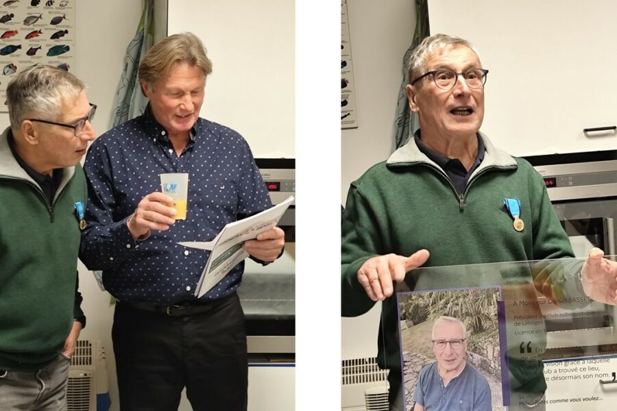 Le 11 décembre à l’occasion de la Saint Daniel/Danielle (et il y en a beaucoup au club) une sympathique manifestation a été organisée au local pour remercier Daniel BASSET. Plongeur depuis 50 ans, fondateur du Club Subaquatique, il a œuvré sans relâche pour la promotion des activités subaquatiques et pour développer le club. Nombreux sont ceux à qui il a su transmettre sa passion, et c’est grâce à lui, qui a su s’entourer de bénévoles motivés, que le club dispose aujourd’hui d’un bateau, de matériel conséquent et d’un local aux multiples usages.